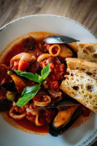 Typically, one thinks of white wines when pairing with seafood, but one should always consider the sauces that the seafood is cooked in and the type of fish. In this case, it is mussels in a red sauce so pairing it with a medium bodied red wine with light tannins like our Barbera is an excellent choice. The savory notes also compliment the briny notes of the olives and capers.