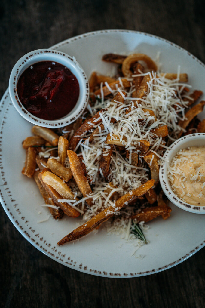 crispy fries, rosemary, parmigiano, black truffle sea salt, Tuscan olive oil, garlic aioli, Chianti ketchup (Veg)