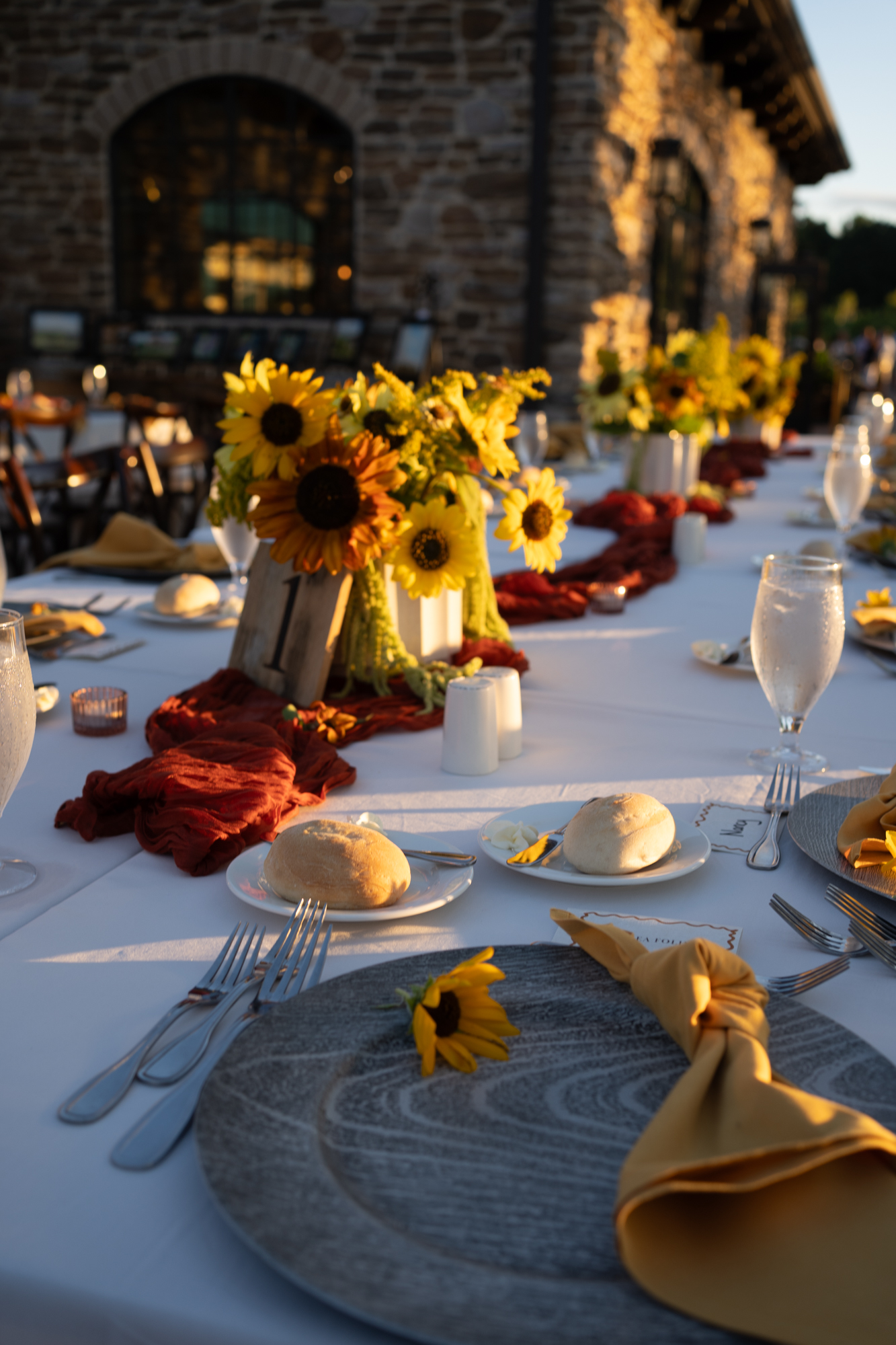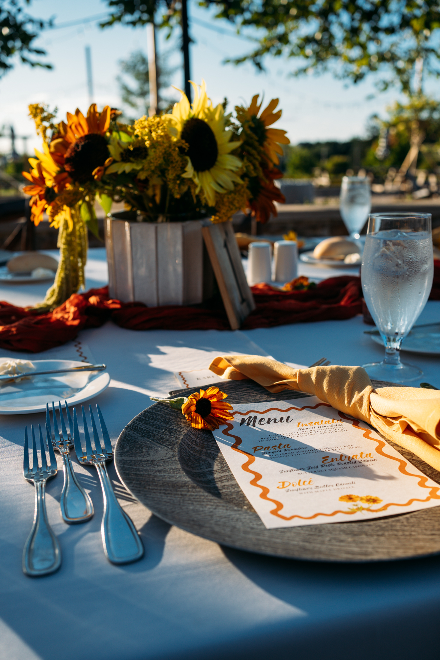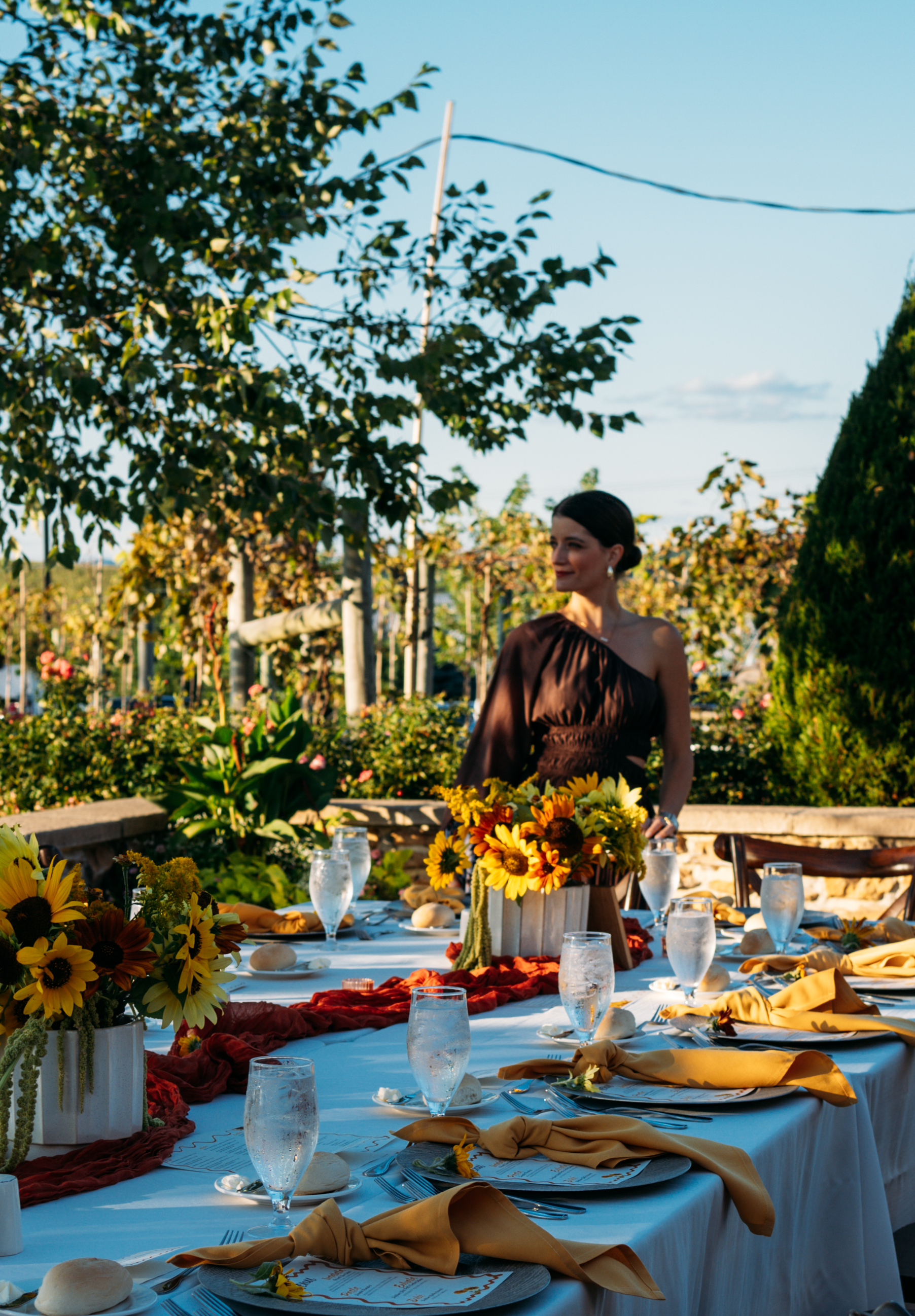 The tablescape was in full bloom as I took inspiration from the stunning sunflowers that had blossomed that season in front of the vineyard. The entire event paid homage to these vibrant symbols of happiness and a fulfilling life. The table decorations and the menu were nothing short of enchanting, setting the perfect tone for our special gathering.
